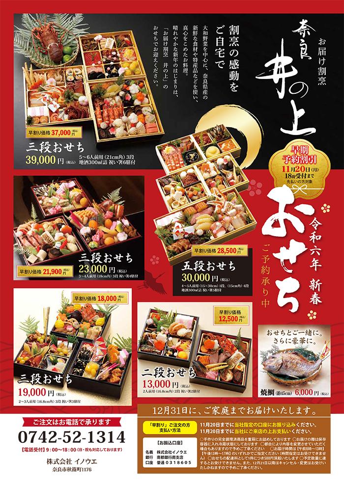 2023.10.13 お届け割烹 奈良 井の上 【終了】令和6年新春「おせち」早期予約受付中! 大和野菜を中心に、奈良県産の新鮮な食材や特産品などを使い、真心をこめたお料理。 晴れやかな新年のはじまりは、「お届け割烹 井の上」のおせちでお迎えください。 早期予約割引は11月20日18時受付まで! ご注文はお電話で承ります TEL0742-52-1314 【電話受付】9:00〜18:00(日・祝も対応しております) PDFでチラシを見る